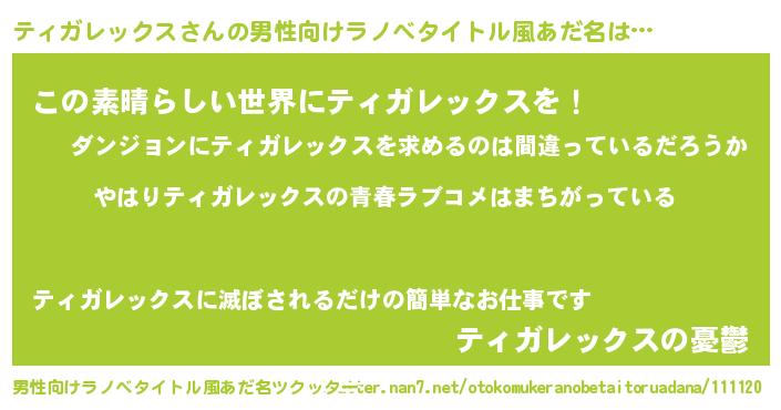 | 女子向けラノベタイトル風あだ名 | 『ティガレックスの雑貨屋さん』 |