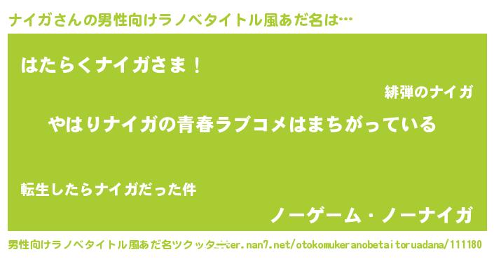 | 女子向けラノベタイトル風あだ名 | 『ナイガの雑貨屋さん』 |