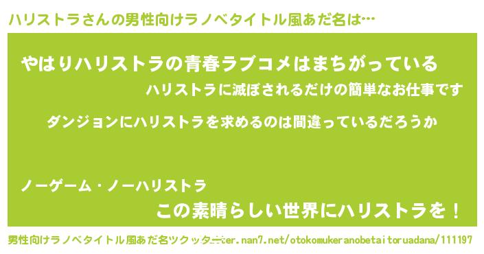 | 胡散臭い通販商品みたいなあだ名 | 『信頼と実績のサプリメント…その名も「ハリストラ」』 |