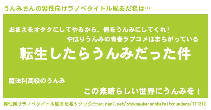 | 女子向けラノベタイトル風あだ名 | 『うんみの玉の輿計画!』『うんみ恋絵巻』 |