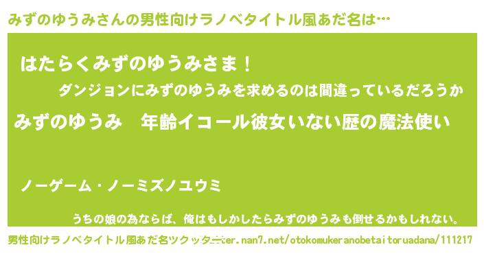 | 女子向けラノベタイトル風あだ名 | 『みずのゆうみの玉の輿計画!』 |