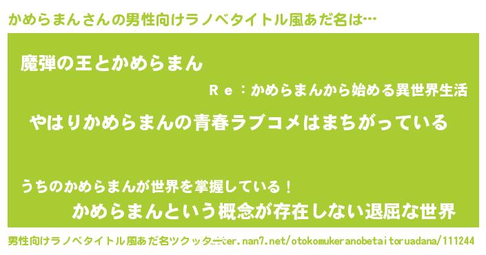 | 女子向けラノベタイトル風あだ名 | 『かめらまんの雑貨屋さん』 |