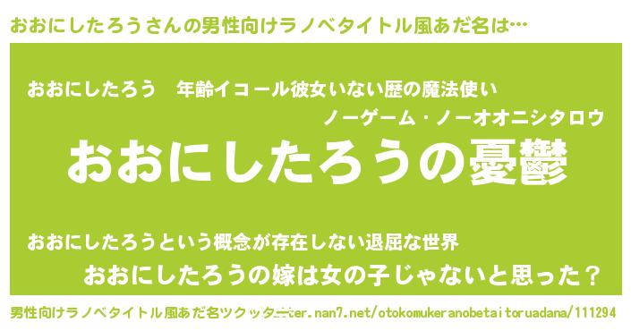 | 女子向けラノベタイトル風あだ名 | 『おおにしたろう姫と円卓の騎士』 |