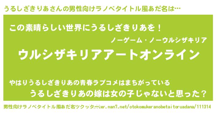 | 女子向けラノベタイトル風あだ名 | 『うるしざきりあ姫と円卓の騎士』 |