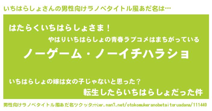 | 女子向けラノベタイトル風あだ名 | 『死神いちはらしょの再婚』 |