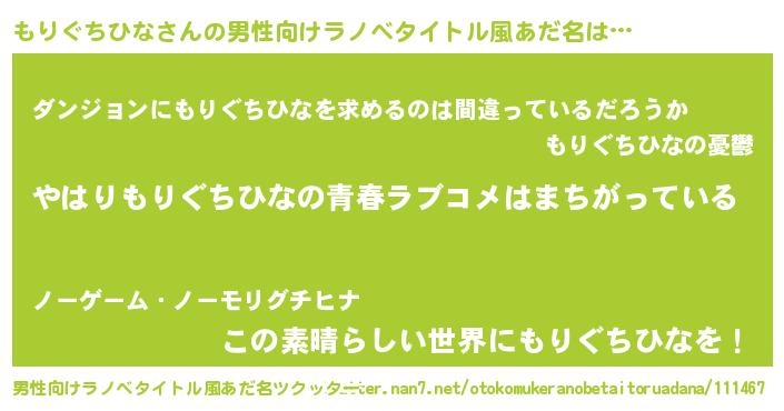 | 女子向けラノベタイトル風あだ名 | 『もりぐちひな伯爵の花嫁』 |