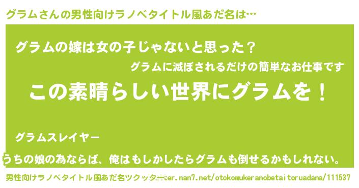 | 女子向けラノベタイトル風あだ名 | 『乙女ゲームの破滅フラグしかない悪役グラムに転生してしまった…』 |