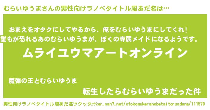 | 胡散臭い通販商品みたいなあだ名 | 『億万長者になれるブレスレット…その名も「むらいゆうま」』 |
