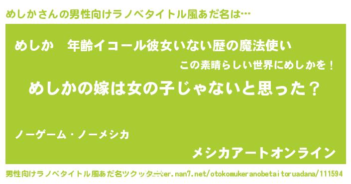 | 女子向けラノベタイトル風あだ名 | 『めしかの卵を拾いまして』 |