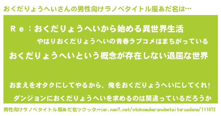| 胡散臭い通販商品みたいなあだ名 | 『来世でも幸せになれる水素水…その名も「おくだりょうへい」』 |