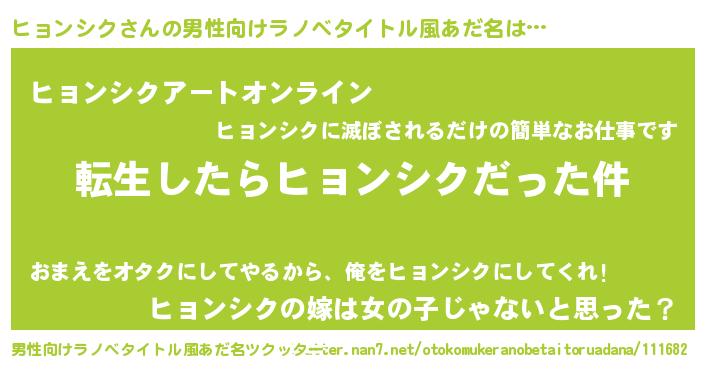 | 胡散臭い通販商品みたいなあだ名 | 『モテモテ間違いなしブレスレット…その名も「ヒョンシク」』 |