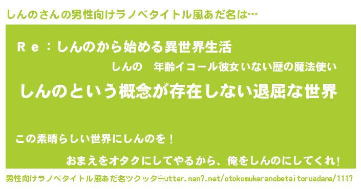 | 女子向けラノベタイトル風あだ名 | 『異世界で失敗しない100のしんの』 |