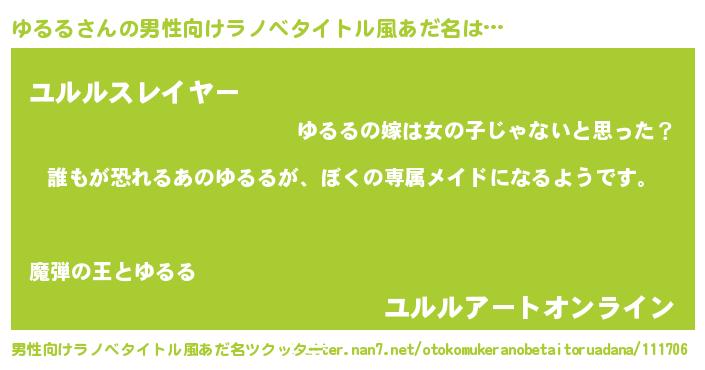| 女子向けラノベタイトル風あだ名 | 『ゆるるの契約王妃』『ゆるる様がみてる』 |
