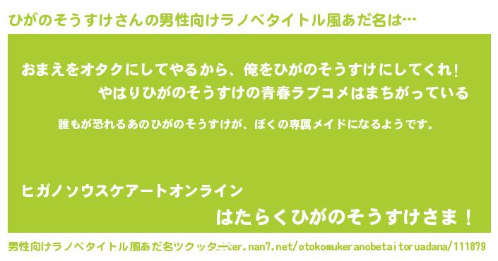 | 女子向けラノベタイトル風あだ名 | 『ひがのそうすけの契約王妃』 |