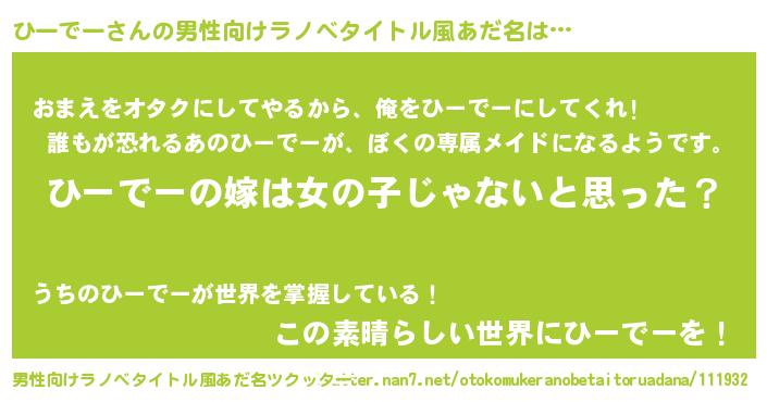| 女子向けラノベタイトル風あだ名 | 『ひーでーの卵を拾いまして』 |