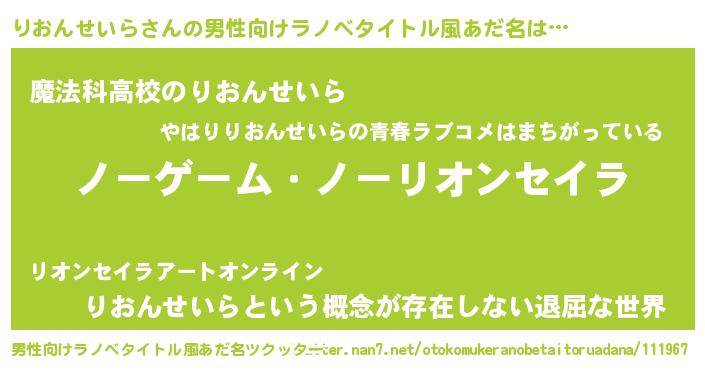 | 女子向けラノベタイトル風あだ名 | 『死神りおんせいらの再婚』 |