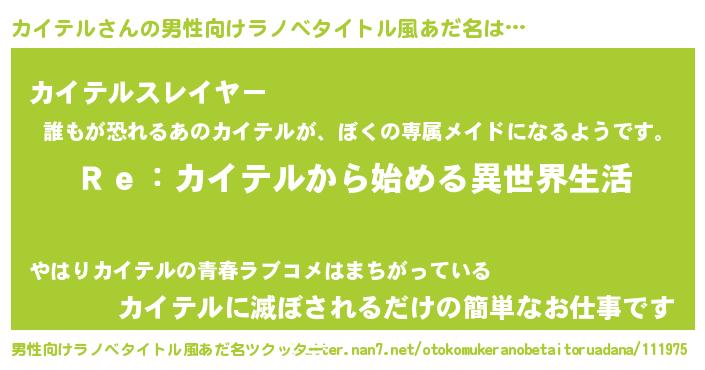| 女子向けラノベタイトル風あだ名 | 『闇のカイテル』『カイテルの雑貨屋さん』 |