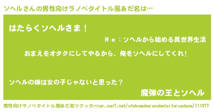 | 女子向けラノベタイトル風あだ名 | 『ソヘル夫妻のなれそめ』『闇のソヘル』 |