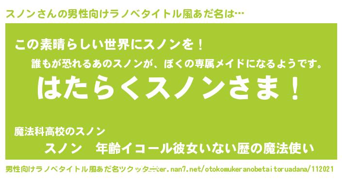 | 意味不明あだ名 | 『住所不定無職スノン(6歳)』『自称スノン』 |