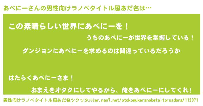| 女子向けラノベタイトル風あだ名 | 『あべにーの卵を拾いまして』 |