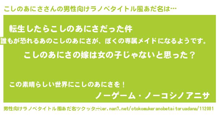 | 女子向けラノベタイトル風あだ名 | 『こしのあにさの卵を拾いまして』 |