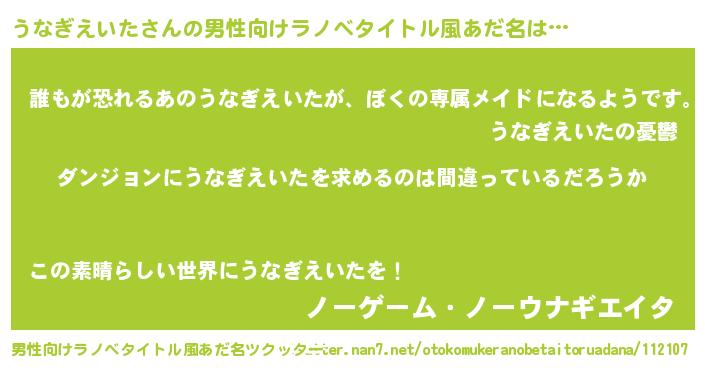 | 女子向けラノベタイトル風あだ名 | 『うなぎえいたの卵を拾いまして』 |