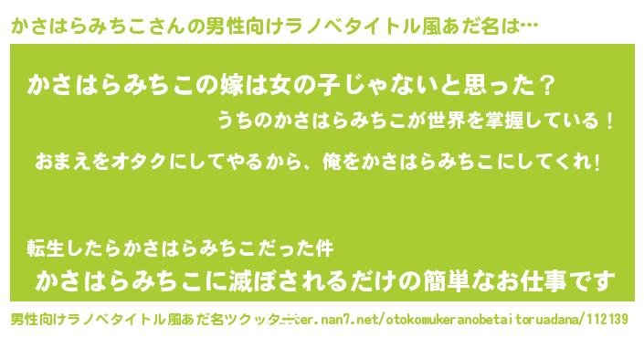 | 女子向けラノベタイトル風あだ名 | 『かさはらみちこ夫妻のなれそめ』 |