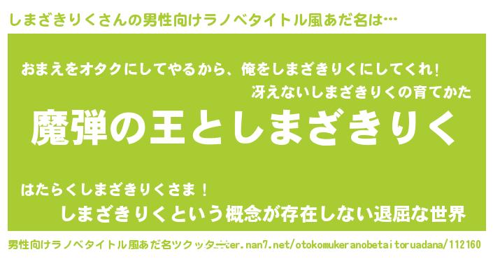 | 女子向けラノベタイトル風あだ名 | 『乙女ゲームの破滅フラグしかない悪役しまざきりくに転生してしまった…』 |