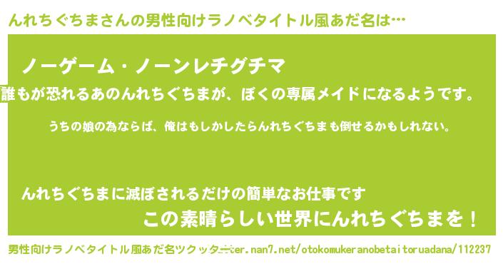 | 女子向けラノベタイトル風あだ名 | 『んれちぐちまの婚約者』 |