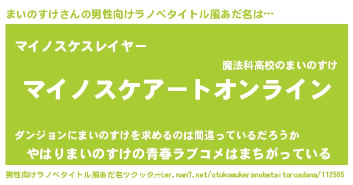 | 女子向けラノベタイトル風あだ名 | 『誰かこのまいのすけを説明してください! ~契約から始まるウェディング~』 |