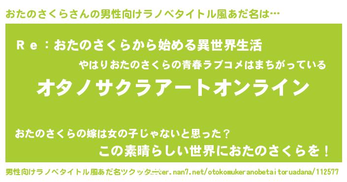 | 女子向けラノベタイトル風あだ名 | 『誰かこのおたのさくらを説明してください! ~契約から始まるウェディング~』 |