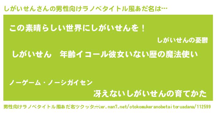 | 女子向けラノベタイトル風あだ名 | 『しがいせんの玉の輿計画!』 |