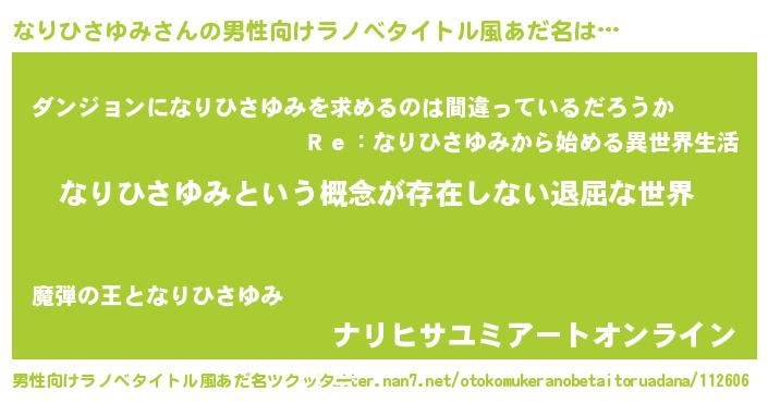 | 女子向けラノベタイトル風あだ名 | 『異世界で失敗しない100のなりひさゆみ』 |