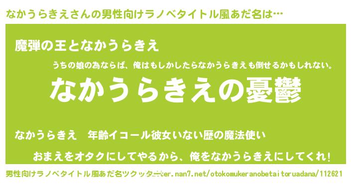 | 女子向けラノベタイトル風あだ名 | 『(仮)なかうらきえのやんごとなき事情』 |