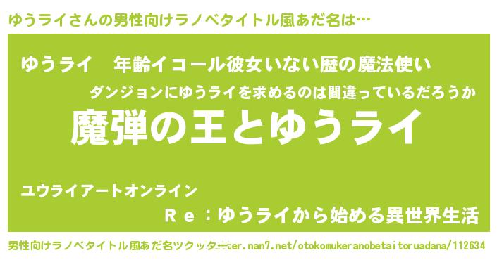 | 女子向けラノベタイトル風あだ名 | 『ゆうライが死なない童話 林檎のゆうライの診療簿』 |