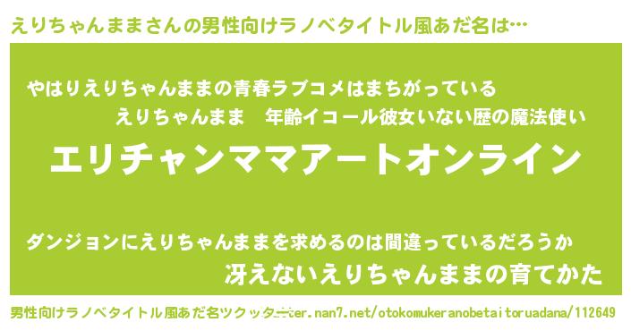 | 女子向けラノベタイトル風あだ名 | 『えりちゃんまま姫と円卓の騎士』 |