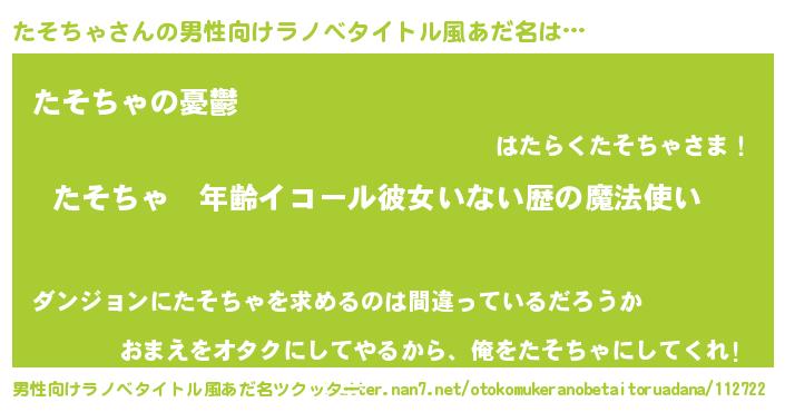 | 女子向けラノベタイトル風あだ名 | 『たそちゃの玉の輿計画!』 |