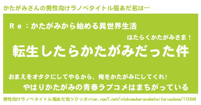 | 女子向けラノベタイトル風あだ名 | 『かたがみの玉の輿計画!』 |