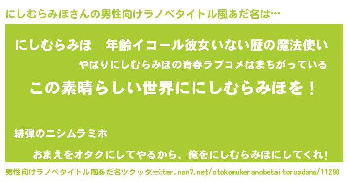 | 意味不明あだ名 | 『住所不定無職にしむらみほ(62歳)』 |