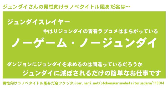 | 伝説のあだ名 | 『救世主となる錬金術士ジュンダイ』 |