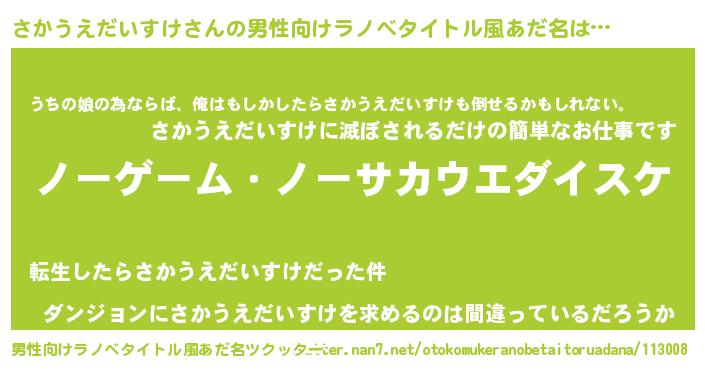 | 伝説のあだ名 | 『救世主となる錬金術士さかうえだいすけ』 |