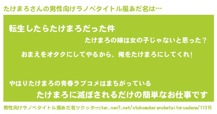 | 女子向けラノベタイトル風あだ名 | 『たけまろ夫妻のなれそめ』 |