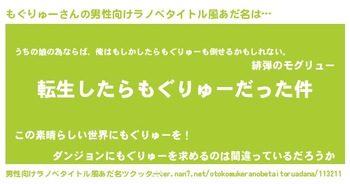 | 女子向けラノベタイトル風あだ名 | 『もぐりゅーの玉の輿計画!』 |