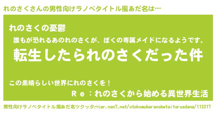 | 女子向けラノベタイトル風あだ名 | 『れのさくの玉の輿計画!』 |