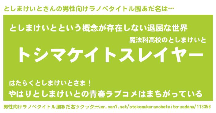 | 胡散臭い通販商品みたいなあだ名 | 『絶対に幸福をもたらす水素水…その名も「としまけいと」』 |