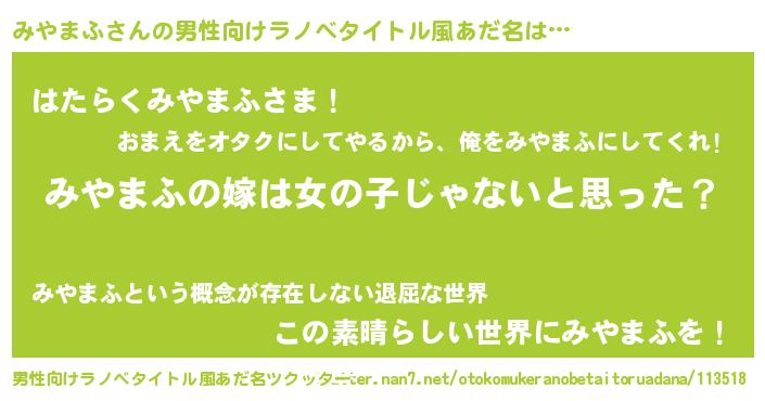 | 女子向けラノベタイトル風あだ名 | 『みやまふの卵を拾いまして』 |