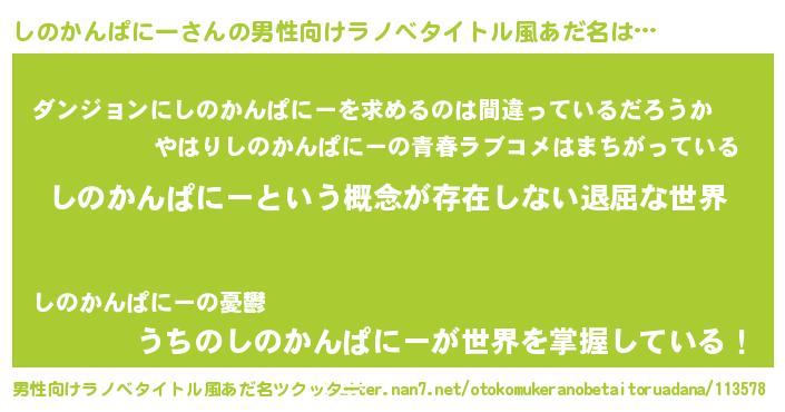 | 女子向けラノベタイトル風あだ名 | 『異世界で失敗しない100のしのかんぱにー』 |