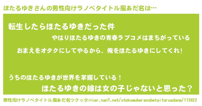 | 女子向けラノベタイトル風あだ名 | 『ほたるゆき夫妻のなれそめ』 |