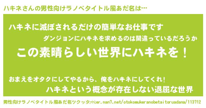 | 意味不明あだ名 | 『住所不定無職ハキネ(6歳)』 |