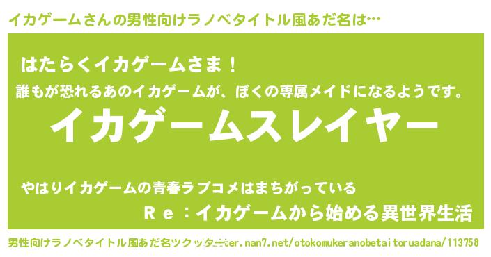 | 女子向けラノベタイトル風あだ名 | 『婚約破棄系悪役イカゲームに転生したので、保身に走りました。』 |